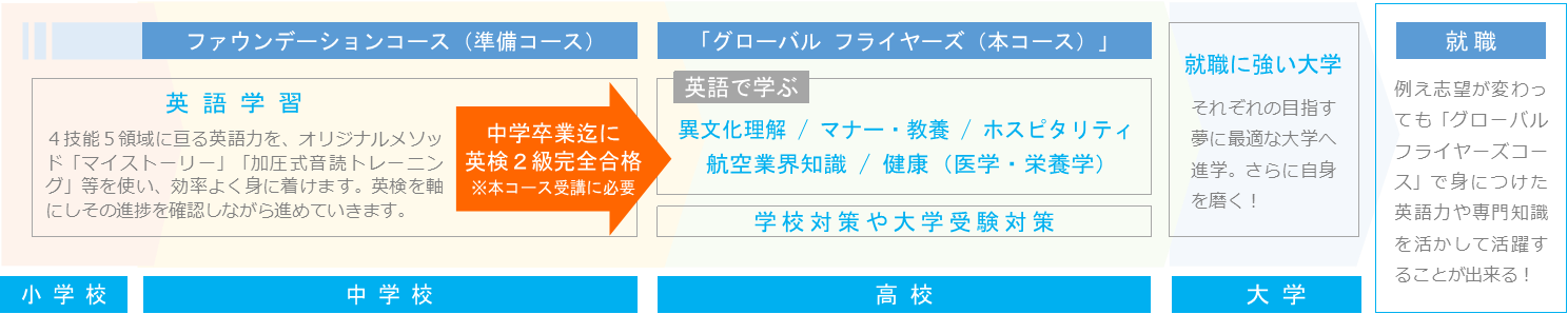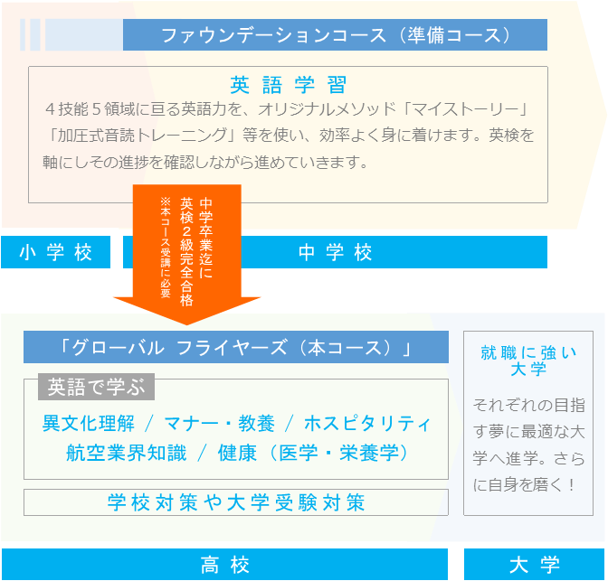 客室乗務員やパイロット等の航空会社、外交官や商社マンなど、国際化が進む世界で活躍することを目指す中高生のためのコースです。