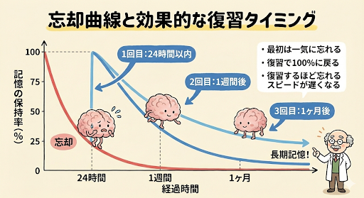ドイツの心理学者エビングハウスの「忘却曲線」によると、人は学習したことを20分後には42%、1日後には74%も忘れてしまうといいます。しかし、適切なタイミングで「反復(復習)」を行えば、記憶は定着し、忘れるスピードは劇的に遅くなります。