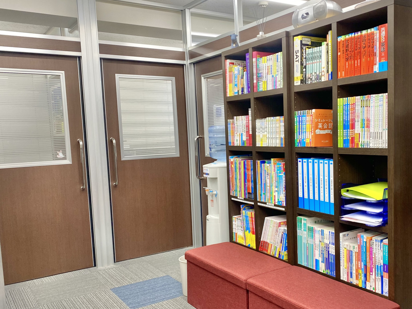 合格実績などの掲示物、面談中に小さいお子様が退屈しないよう本や塗り絵も用意しています。