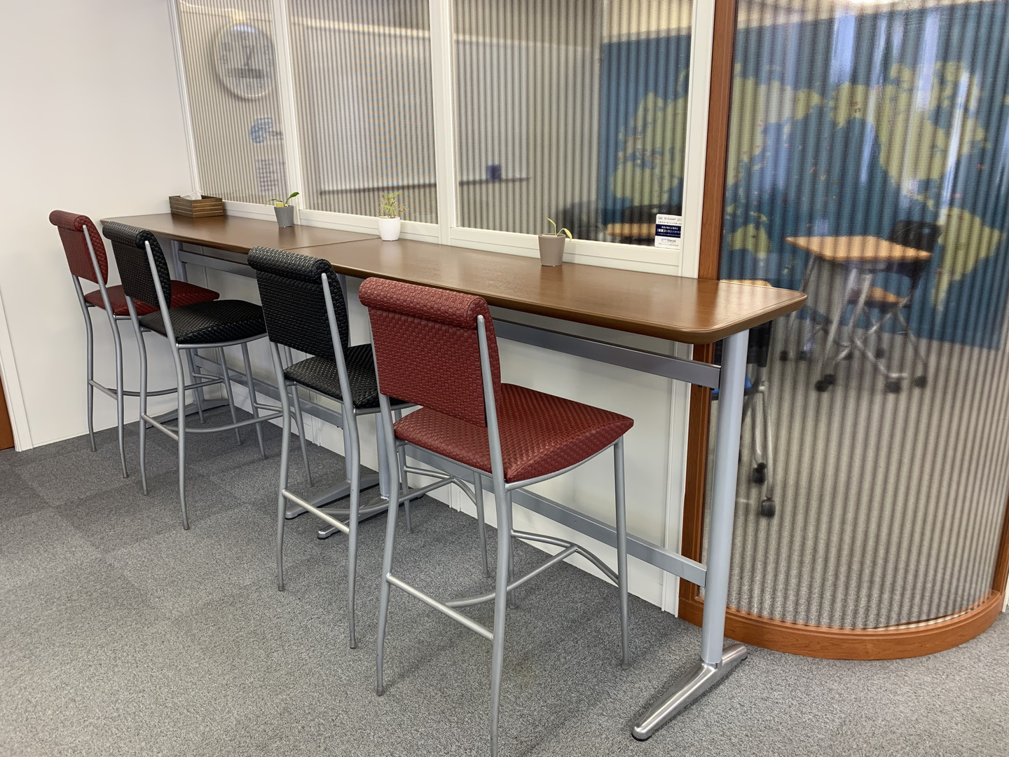 自習に活用できるカウンター式のスペースです。授業の合間に休憩もできます。