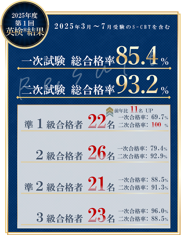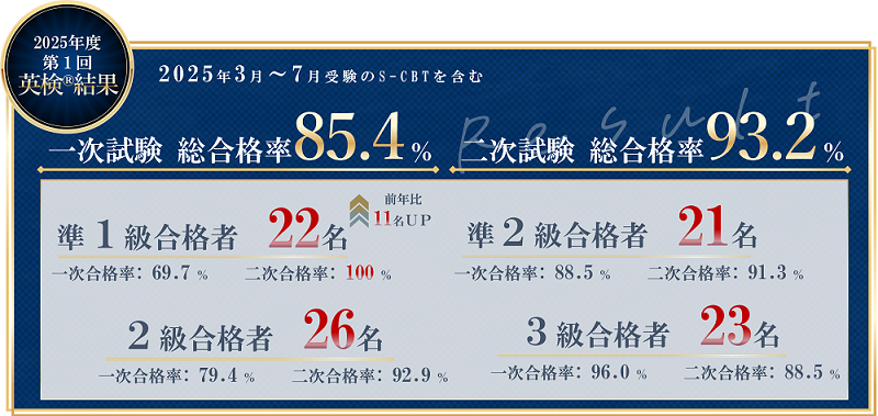 | 準2級 | 26名 | 23名 | 88.5% | 23名 | 21名 | 91.3% | ~30% |