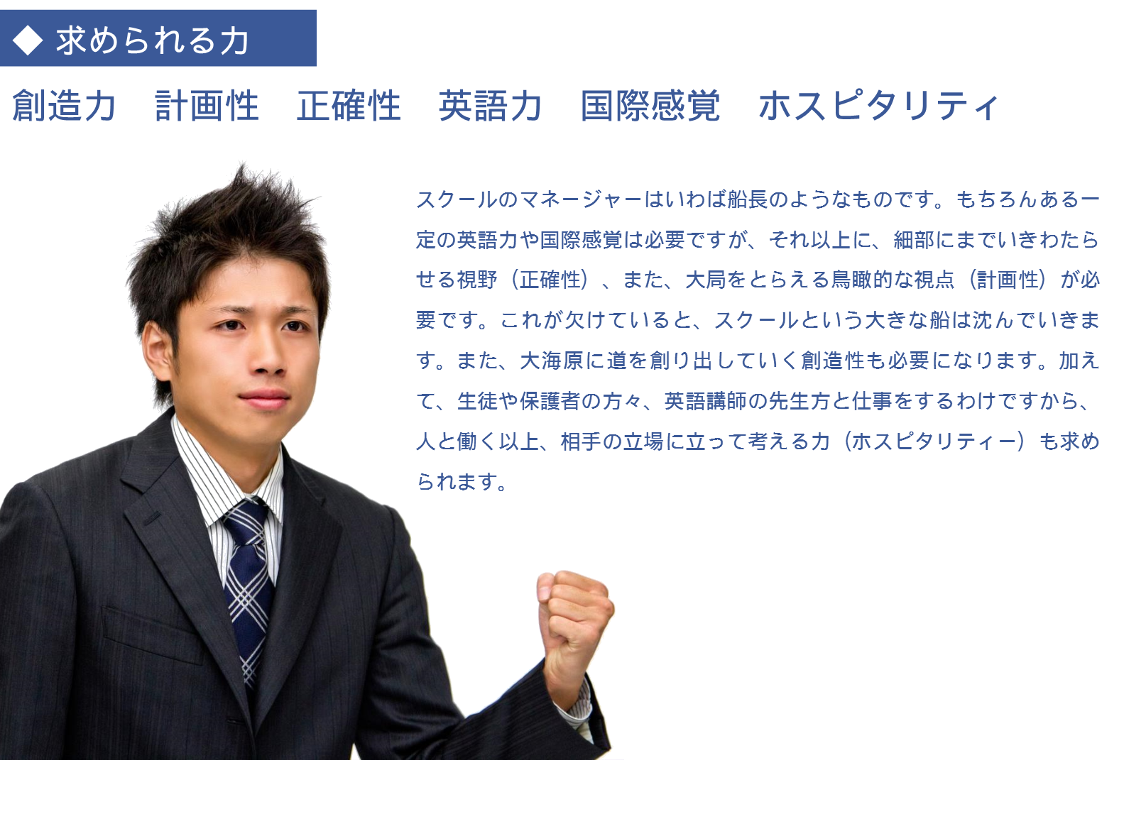 応募資格 | ≪必須≫ 日本または海外の大学を卒業していること ≪その他優遇される点≫ 学習塾やスクールでの指導経験、マネジメント経験がある ※英語力に自信がない、もしくは業界未経験でも研修制度が充実しているのでご安心ください。 |