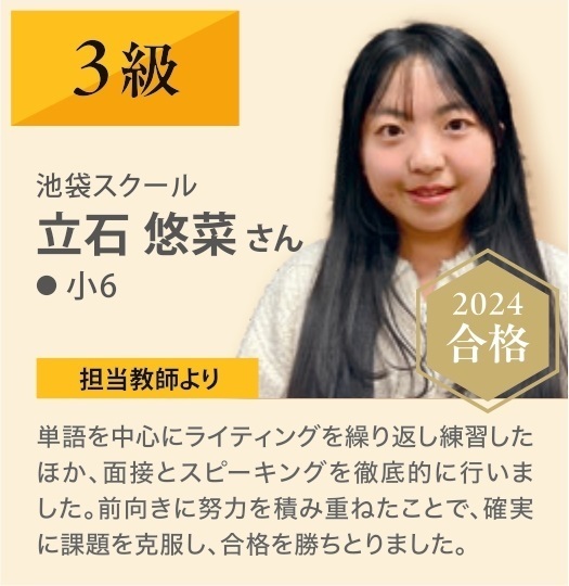 S.Y.さんは習い事や興味のあることも多く、常に時間との勝負でした。時間を見つけてはよく自習に来て勉強し、苦手な分野をできるようになるまで徹底的に勉強することを積み重ねた結果、合格につながったと思います。合格おめでとうございます!(担当 石田誠)