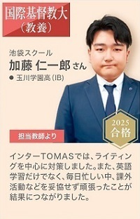 中学校3年生からインターTOMASに通い始めました。特に英語の文法に不安があり、レッスンでは文法と英検対策、そして都立高校IB対策をおこないました。苦手としていた文法も先生に丁寧に指導して頂き、文法を克服してからはライテイングのミスも大きく減りました。高校受験が近づくに連れ不安も大きくなっていきましたが、先生方のサポートや授業のない日も自習室に通うことで色々な方から声をかけていただき不安が少しずつ和らいでいきました。大学は海外の大学を目指し、芸術や哲学など様々な分野に挑戦していきます。