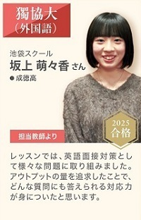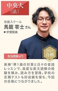 S.K.さんは長文読解を得意としていましたが、大学受験レベルの問題を制限時間で解くにはスピードが不足していましたので、英文解釈、スラッシュリーディング、パラグラフリーディングなどで読解スピードを強化しました。合格おめでとうございます!(担当 石田誠)