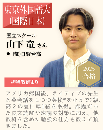 都立国立高校を卒業後、東京大学理科二類に進学。英検取得と受験対策のため、中2の時にインターTOMASに入会。英語を確実な得点源とすることで、高校・大学受験のどちらもインターTOMASのみの通塾で第一志望校に現役合格。生徒として長期間在籍した経験を活かし、現在は英検、学校の授業対策、受験対策、リメディアルコースの他教科など幅広く担当。英検準1級。