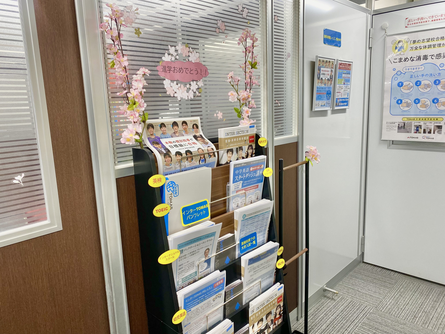 合格実績などの掲示物、面談中に小さいお子様が退屈しないよう本や塗り絵も用意しています。
