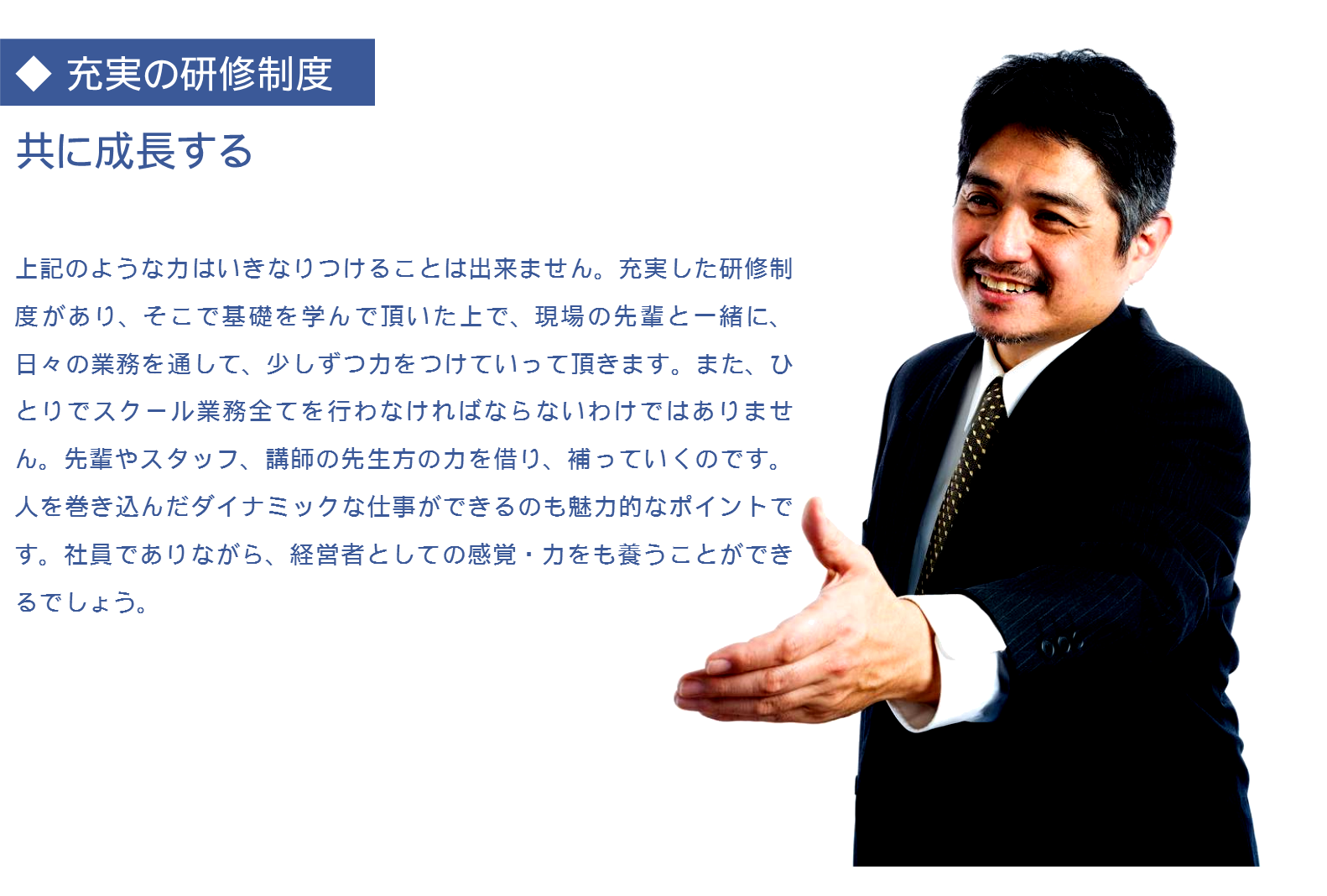 | 勤務地・交通 | 首都圏に展開する各スクール 池袋、市ヶ谷、大崎、国立、渋谷、三鷹、目黒、荻窪、横浜、桜新町、自由ヶ丘、田町 |