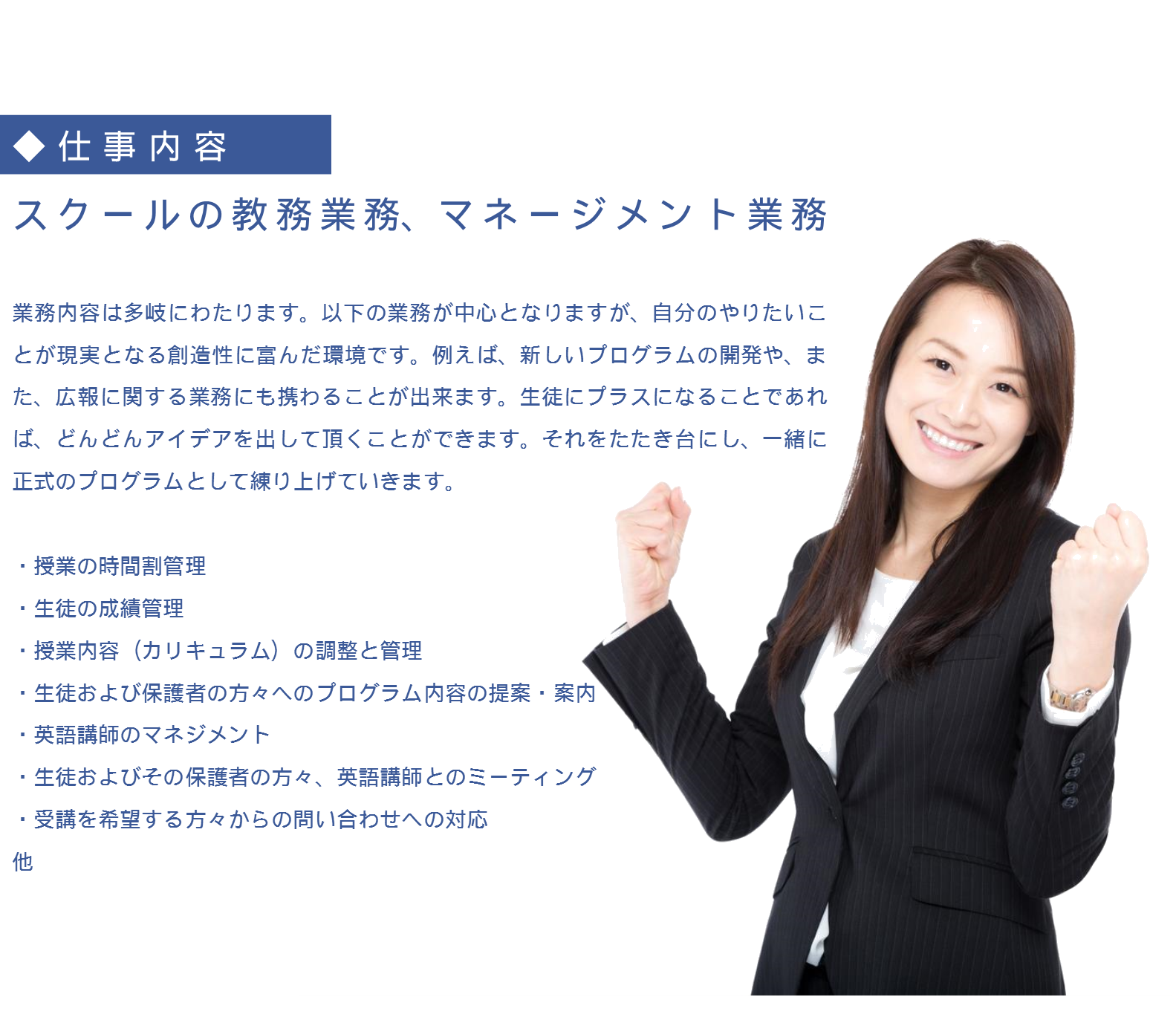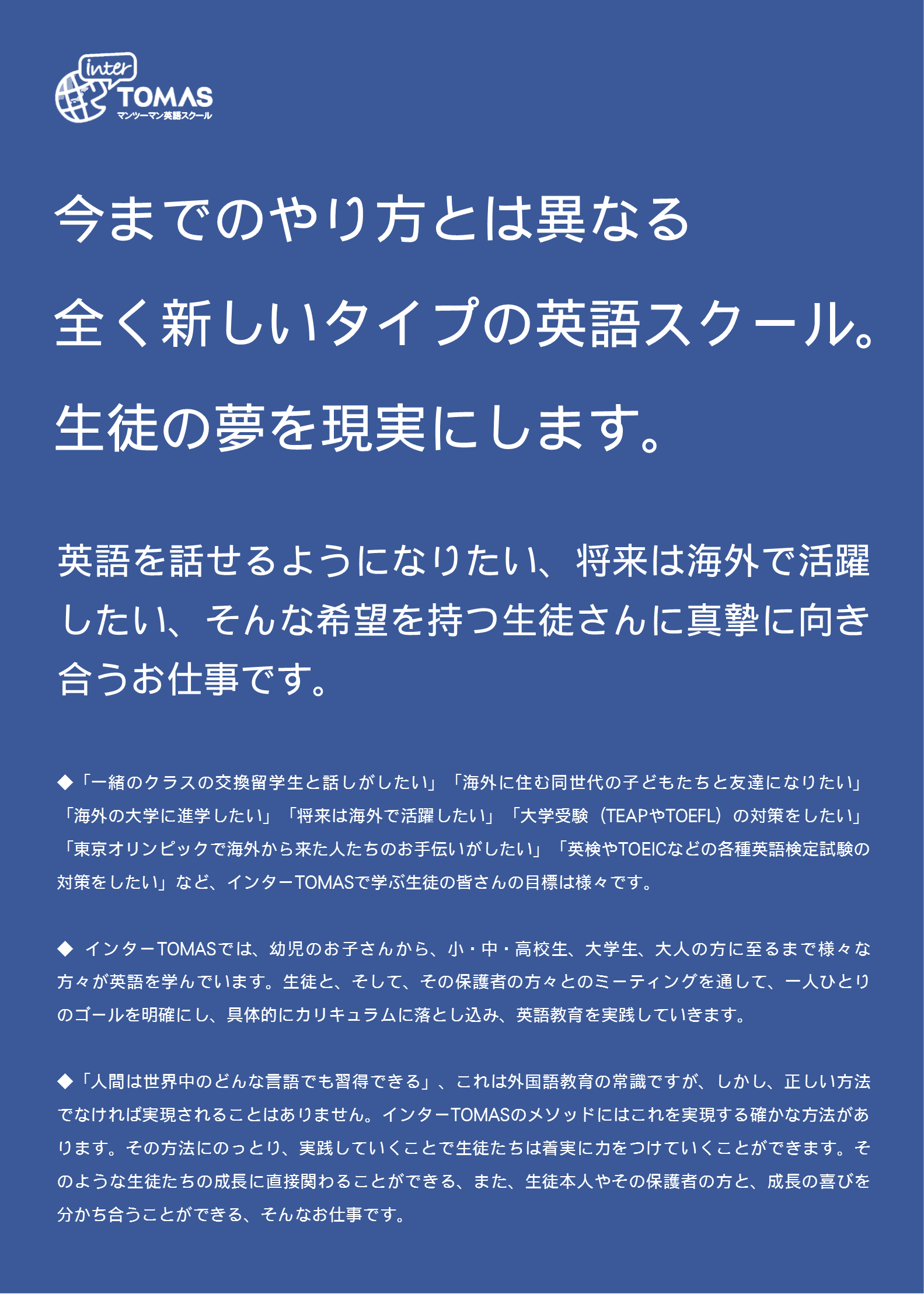| 募集背景 | 設立から右肩上がりの着実な成長を遂げているインターTOMASですが、成果の出る独自メソッドにより、保護者の方からの問い合わせが増加しています。また、校舎のリニューアルや新校の設立を見据え、今後、中心メンバーとして活躍してくれる方を随時募集致します。 |
